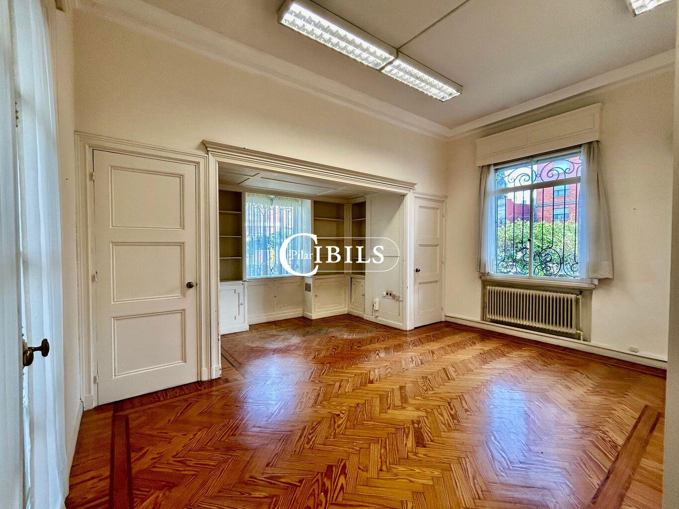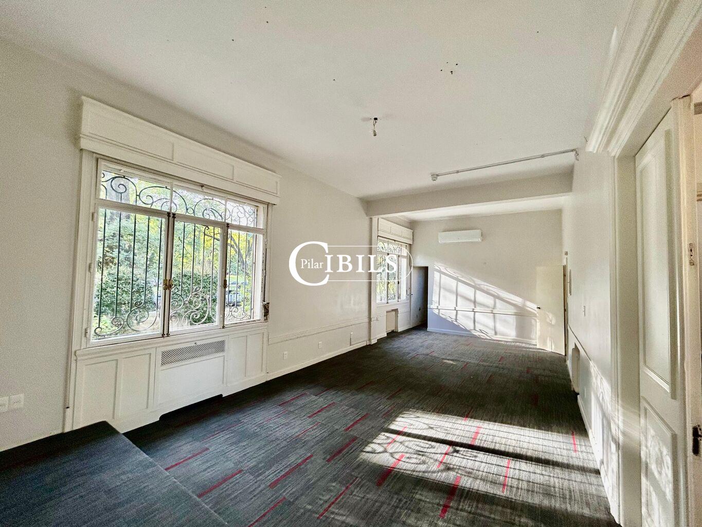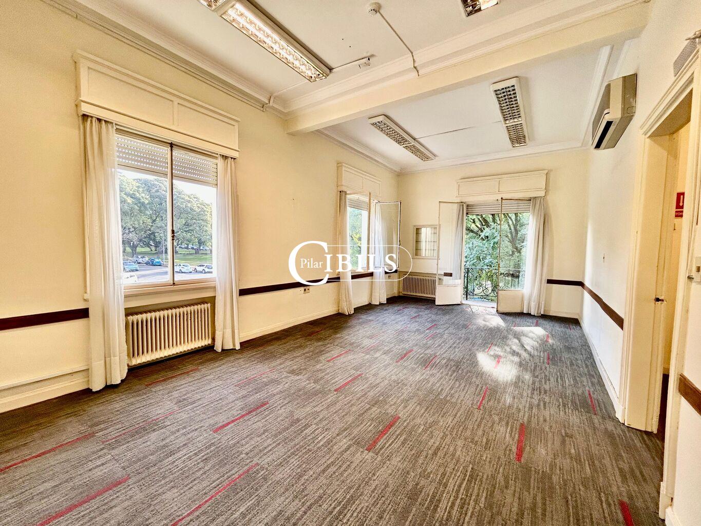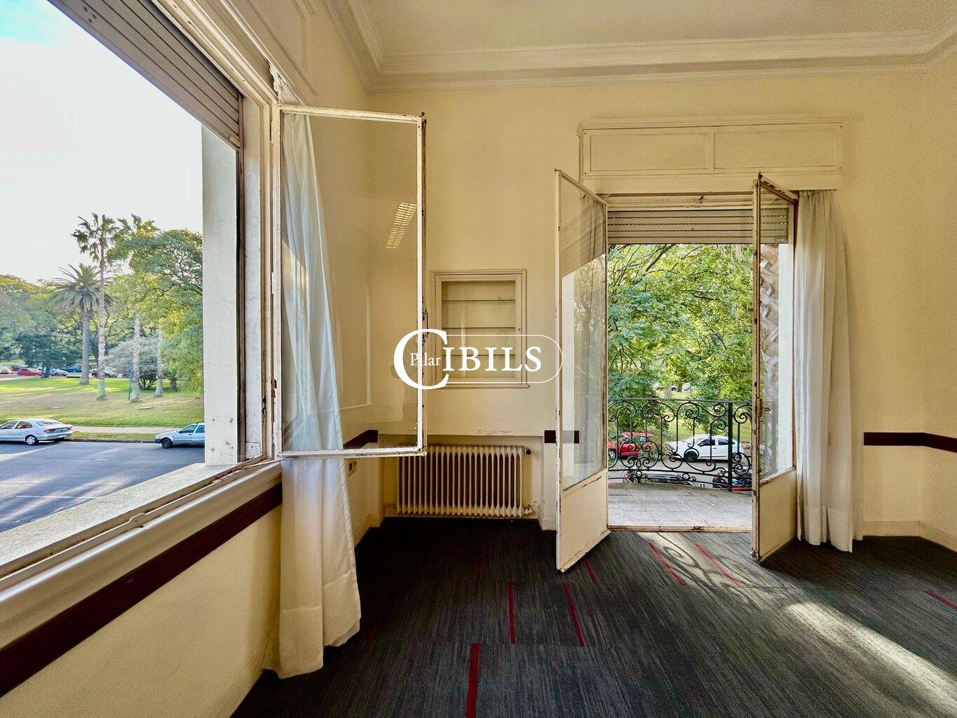 En planta alta, hay una gran hall de distribución, 2 grandes salones al frente con balcones al Parque, 2 oficinas, 2 baños, y en otro sector hay 3 oficinas más.